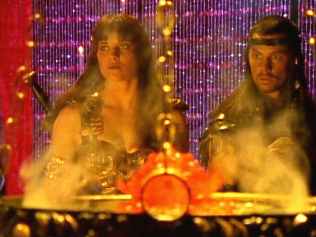 - Xena doesn't use her chakram in this episode. In fact, it doesn't even appear on her side like it normally does. This is probably because Xena keeps a pouch on the hook where her chakram usually is.